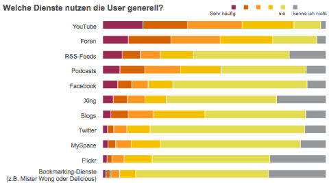 Man muss sagen, dass die Nutzer eher überdurchschnittlich alt sind verglichen mit der bundesdeutschen „Online-Bevölkerung“ insgesamt. Trotzdem: Außer Wikipedia, YouTube und Foren sind Web2.0 noch nicht so weit angekommen. Immerhin ist Twitter wird doch weitreichender genutzt als ich befürchtet habe.