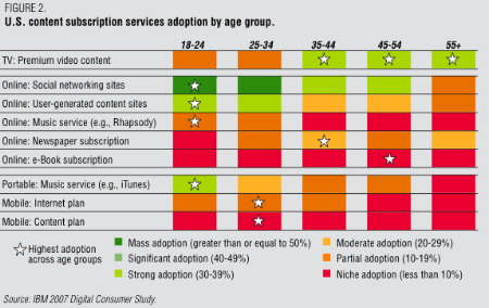 Schon letztes Jahr hat die „Media and Entertainment“-Gruppe der IBM-Unternehmensberater eine Studie veröffentlicht, für die in mehreren Ländern 2400 Verbraucher nach ihren Mediennutzungsgewohnheiten und 80 Werbe-Verantwortlichen nach ihren Einschätzung zur Entwicklung der Werbung in den nächsten fünf Jahren befragt wurden. Obwohl letzteres natürlich von beschränkter Erkenntnisgenauigkeit, ist die Studie gleichwohl sehr lesenswert, weil sie greifbar illustriert, wohin die Reise geht: Weg von der Massenberieselung durch TV-Spots hin zur mühsamen Arbeit am „Long tail“. So weit, nichts Neues.