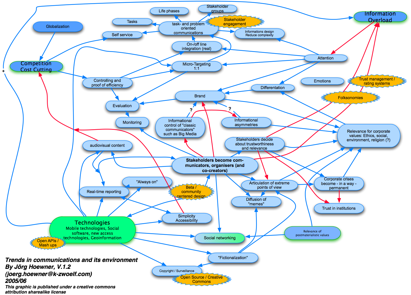 - Die gängigen Modelle gehen in der Regel von einer Rollenverteilung Sender/Empfänger, Kommunikator/Rezipient, Organisation/Stakeholder aus. Wie sieht PR eigentlich in einer vernetzten – das meine ich nicht nur technisch, sondern auch soziologisch – Welt aus? Neue Denkmuster sind erforderlich, wenn man die Beziehungen von Netzwerkteilnehmern untereinander besser verstehen will, wie sie unter anderem von Social Software ermöglicht wird. Einige frühe Überlegungen zum Beispiel gibt es dazu von Don Dunnington im IAOC-Blog.